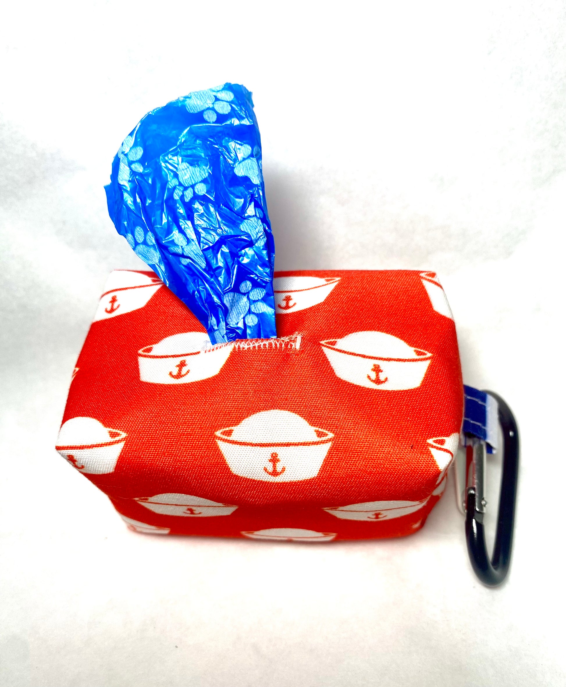 Celebrate your pet’s patriotic spirit with the red Sailor’s Cap Pet Poo Bag Dispenser! Featuring a fun sailor’s cap design in white on red fabric with classic white topstitching and contrasting navy striped accent tabs. With a multi-roll capacity and included carabiner clip, these pouches make cleaning up a breeze while adding a splash of nautical charm to your walks. Durable, easy to use, and perfect for any proud pet parent ready to sail through cleanup duty. Locally handcrafted in the beautiful Florida Keys. Included with pouch: One (1) roll of poo bags, One (1) carabiner clip.